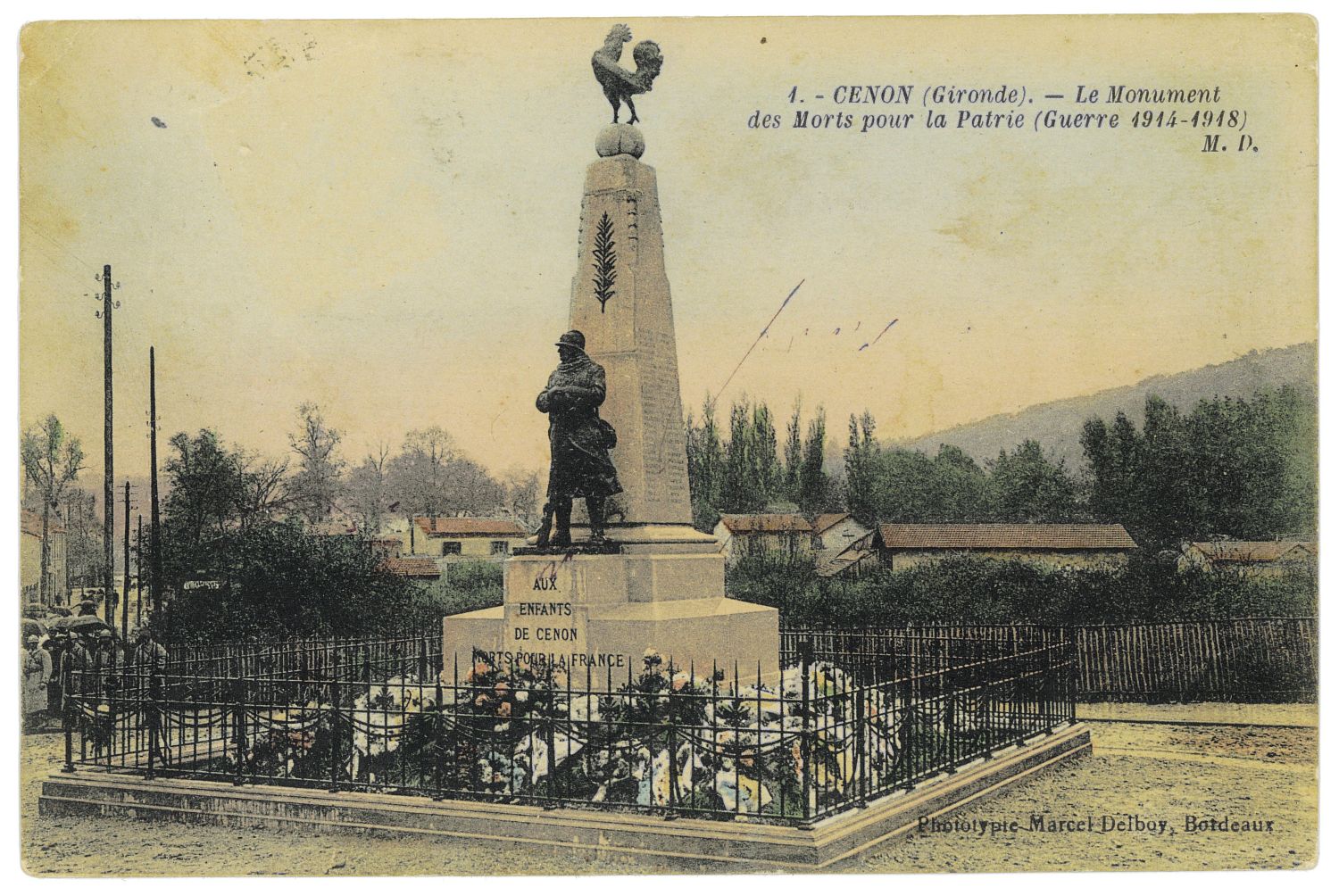 La municipalité alloue 2 000 francs au Comité du monument des soldats morts pour la France pour l’accomplissement de l’œuvre. L’élaboration des plans est confiée à Robert Mialhe, qui y inclut le soldat inconnu et le coq, moulages des sculptures de René Bertrand-Boutée réalisées pour les monuments aux morts du pays. Inauguré le 11 novembre 1923, l’édifice rend hommage aux 168 soldats cenonnais disparus lors de la première guerre.