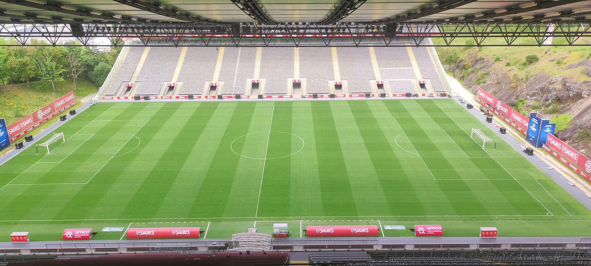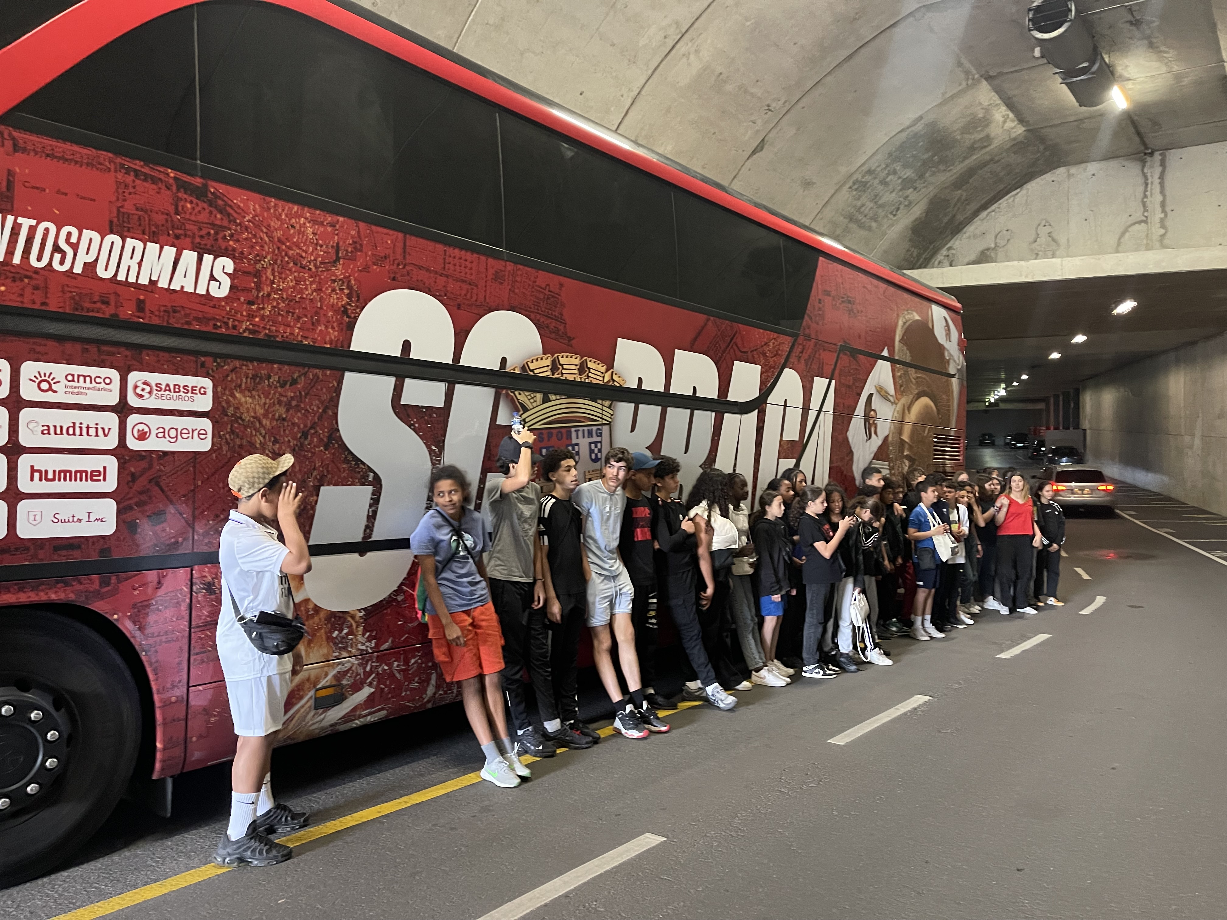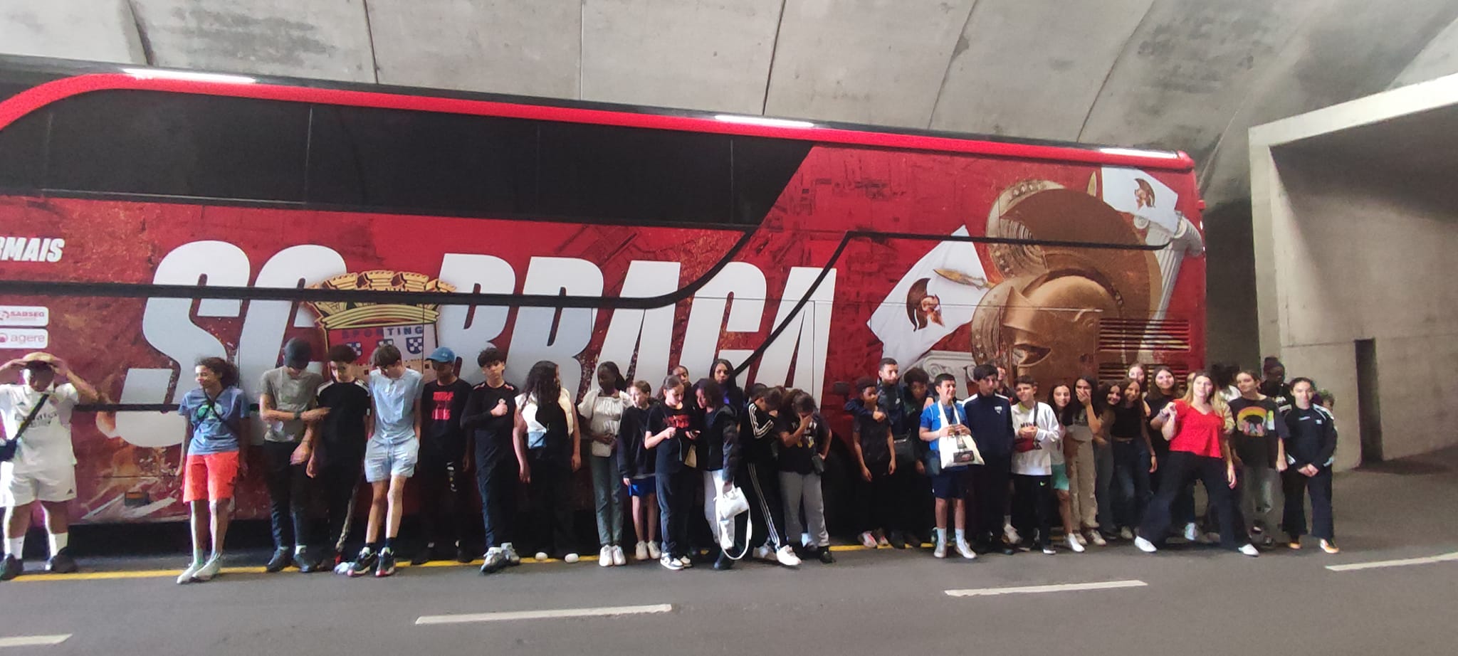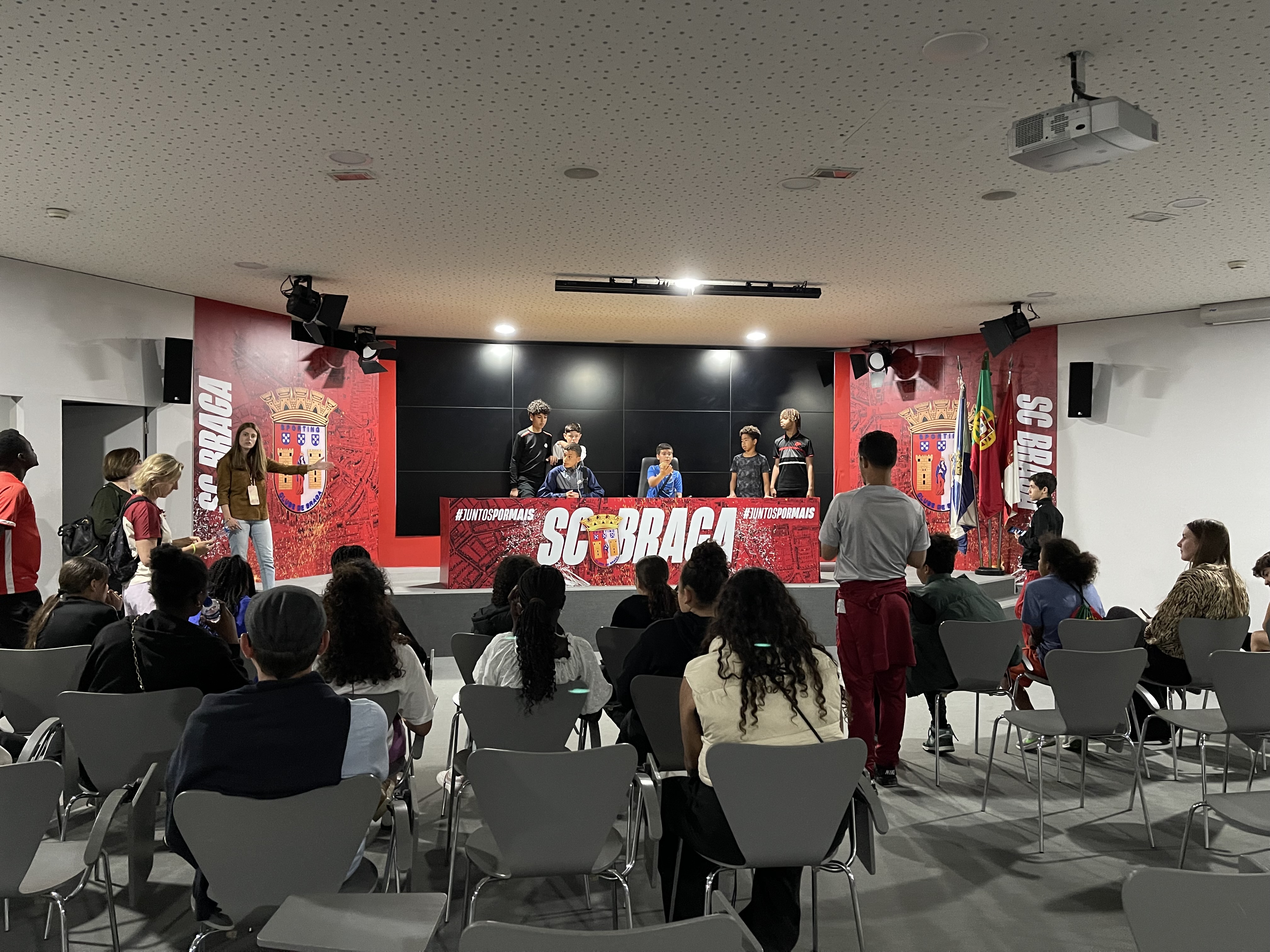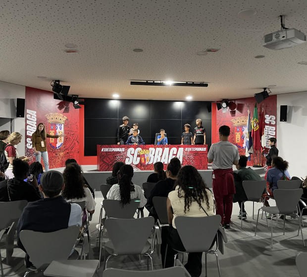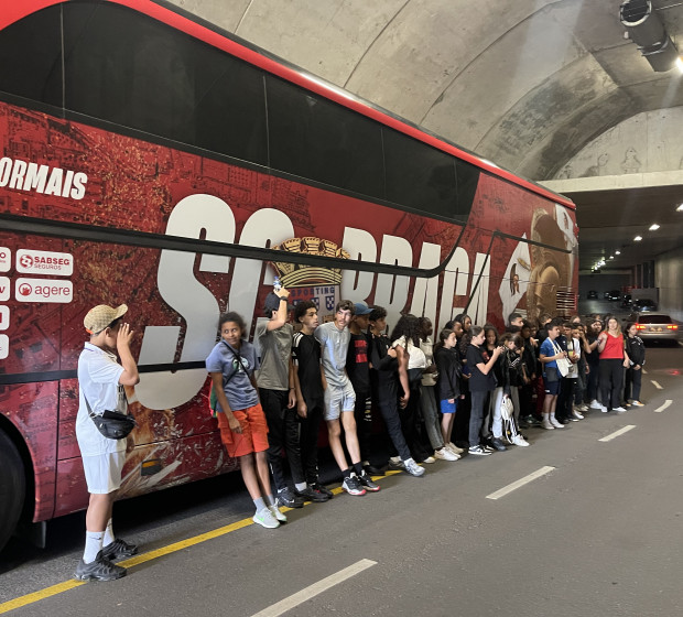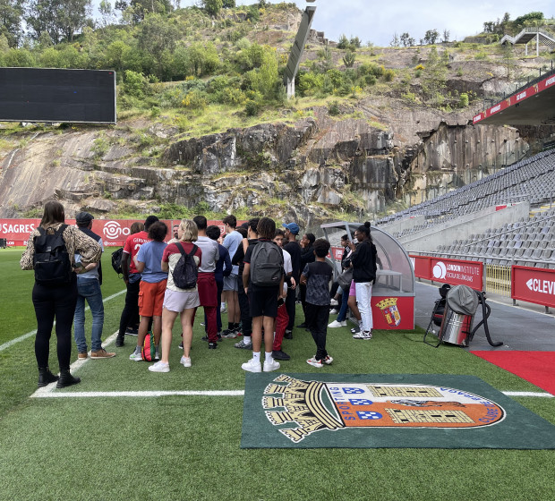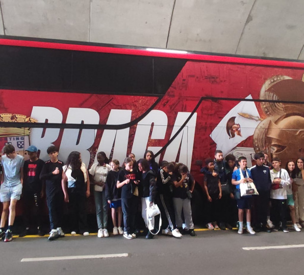 Ils ont mangé au restaurant avant de repartir en bus vers le stade de Braga. La visite leur a donné à voir l'architecture particulière du stade, construit directement dans la roche, avec deux tribunes frontales et un travail sur la lumière naturelle. Cette visite a été réalisée avec les jeunes de Paredes de Coura et a permis de connaitre le club réputé localement.